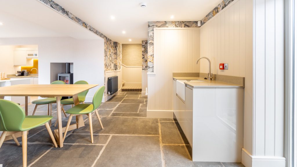 As you come into the entrance hall you’ll see original slate flooring, which we discovered under layers of floorboards and rubble. These have been lifted and carefully restored to provide a beautiful, traditional Lakeland floor. Here we have boot room area with lots of storage and a Belfast sink for cleaning up after a muddy walk. Board games are stocked in the Boot Room if you fancy a go at some Lake District Monopoly.